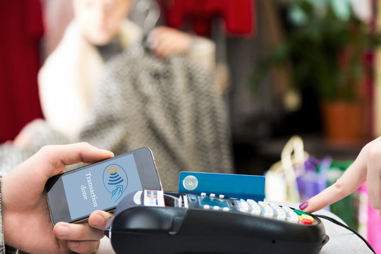 Man completing mobile Payment at Store Cashiers Desk with Terminal