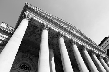 London - Royal Exchange at Bank Junction. Black and white retro style photo.