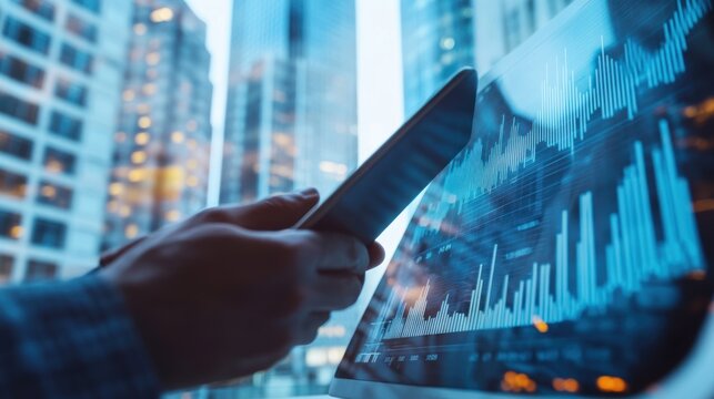 Business professionals analyzing financial charts on a digital tablet, with a background of city skyscrapers, showcasing modern banking and finance Close-up photo with clean background