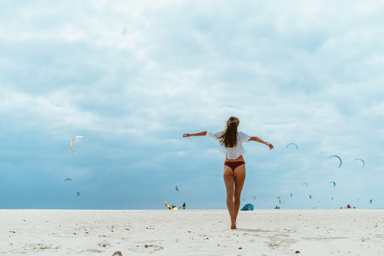 A girl in swimming trunks and a white blouse goes towards flying kites. view from the back. sky, sea, beach