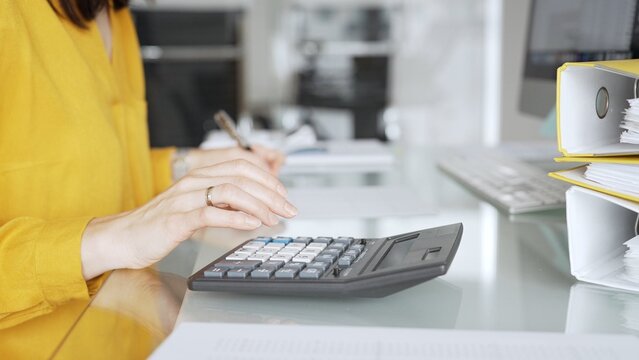 Woman in yellow blouse calculating finances, managing budget, doing taxes, working on accounting documents in office workspace. Audit and taxes in business
