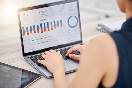 Screen, laptop or businesswoman trading on stock market, fintech app or cryptocurrency growth. Charts, financial trader or hands on technology for dashboard statistics, investment or finance graphs