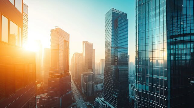 Looking up at high rise office buildings at sunset in the financial district of a modern metropolis, business and finance concept.