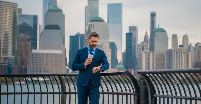 Business man drink coffee outdoor. Business man walk in business district at Manhattan. Business man in a suit standing in front of a office building in New York City. Outdoor portrait of Hispanic