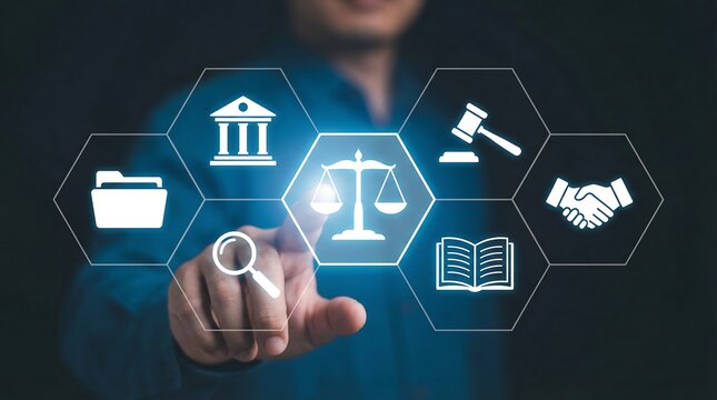 Professional lawyer interacting with futuristic digital interface featuring legal icons, representing innovation in law and justice
