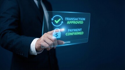A businessman in a suit interacting with a digital payment confirmation interface