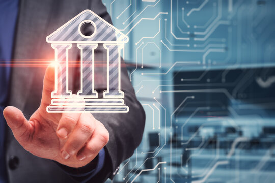 Modern bank building with digital interface overlay