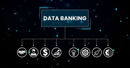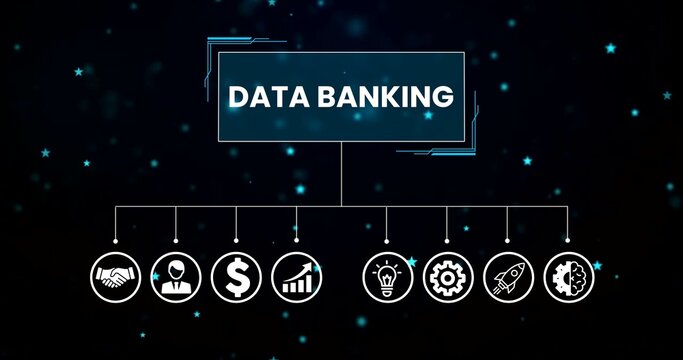 Animated rocket and gear icons representing workflow and progress on digital interface, Data Banking presentation page