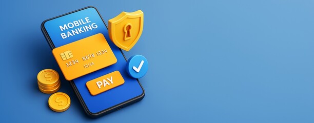Mobile banking concept with smartphone, credit card, coins, shield, and payment icon on blue background with copyspace for design or banner. Ai generative