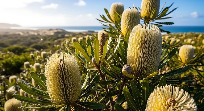 A coastal scene featuring salt-tolerant Australian flora like spinifex and coastal banksia growing near sandy dunes