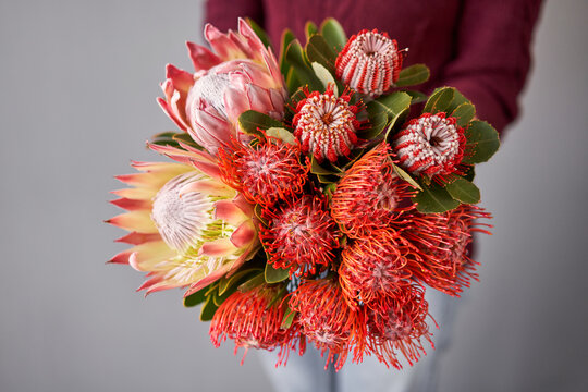 Protea and Banksia flowers in red, pink, yellow and green on a white background, photographed from above.