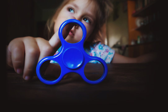 Little beautiful girl in yellow t-shirt is playing with two spinners in hands