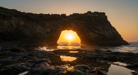 Karang Copong Natural Stone Archway Sunset Seascape Ujung Kulon National Park Indonesia