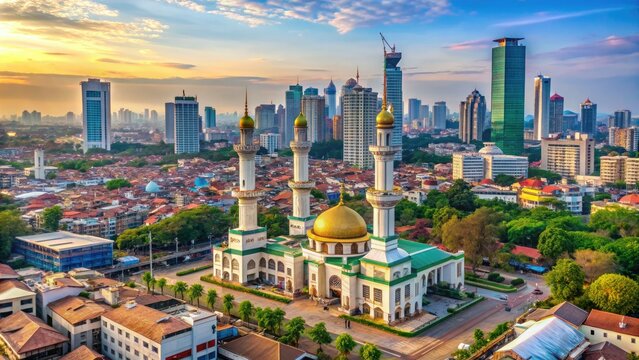 Vibrant cityscape of Tangerang, Indonesia, featuring modern skyscrapers, bustling streets, and ornate mosques, showcasing the city's blend of traditional and contemporary architecture.