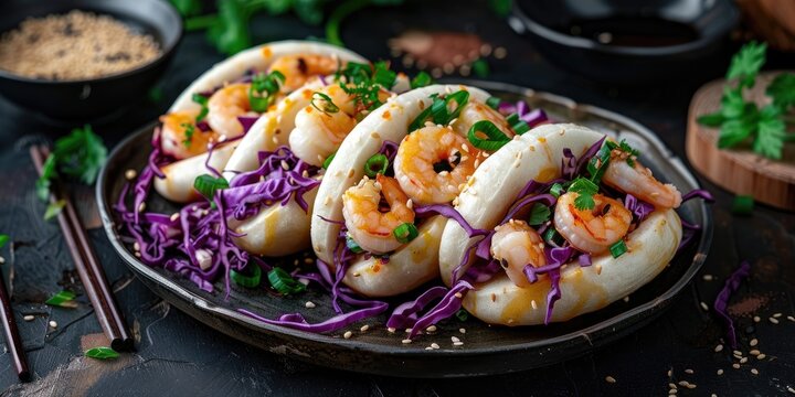 Steamed Bao buns with shrimp purple cabbage and wasabi on a dark table backdrop