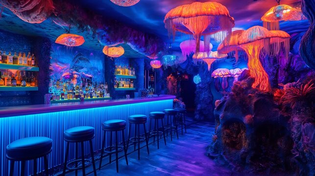 Cool neon blue lighting accentuates the trendy bar interior and its inviting atmosphere