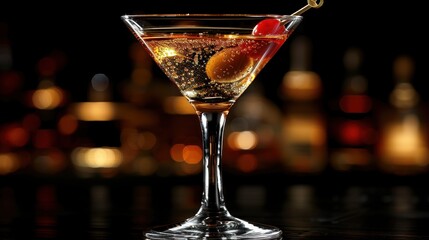 Elegant cocktail served at a dimly lit bar with a warm ambiance and sparkling bubbles. Generative AI