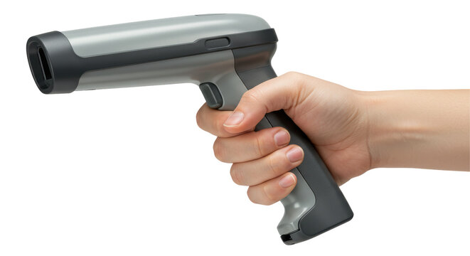 Employee extending scanner toward customer's phone at delivery counter. Worker reaching with barcode reader to scan patron's mobile device at pickup station