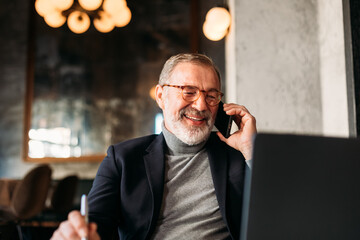 Handsome man in blue sweater working with laptop at the bar of the modern cafe interior