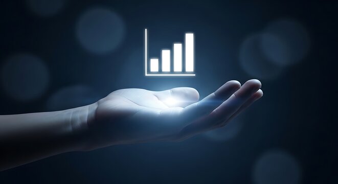 A glowing bar graph icon hovers above an open hand, representing data analysis and business growth in the digital age