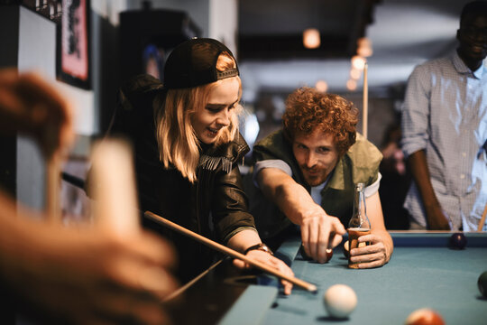 Couple sharing joyful moment in bar with friend occupied on smartphone