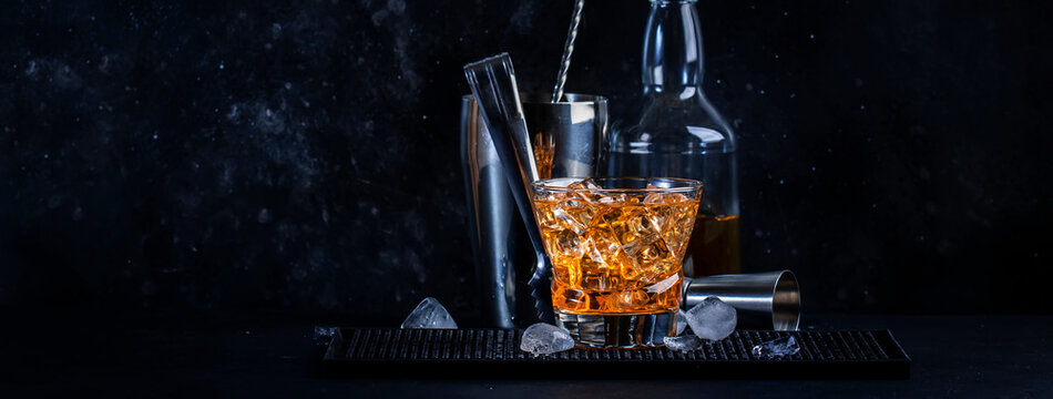 Godfather alcoholic cocktail with scotch whiskey, amaretto liqueur and ice. Black bar counter background, steel bar tools, copy space banner