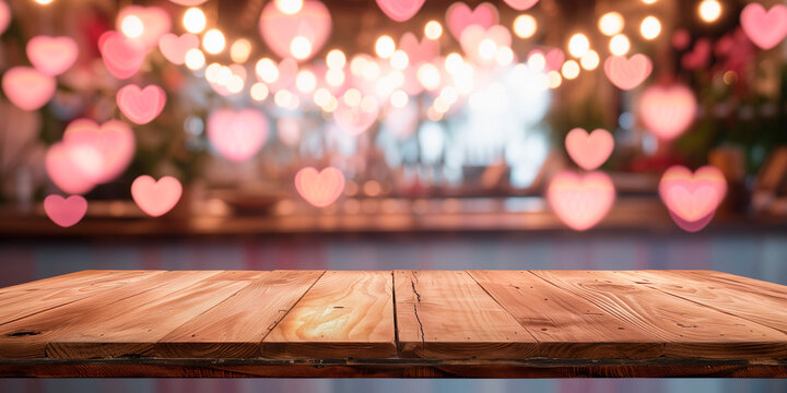 Empty wooden table in front of pink heat shape blurred valentine day light background for product display in a coffee shop, local market or bar