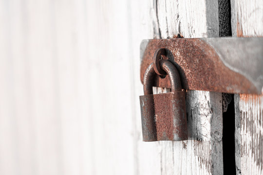 Rusty lock on a wooden door in a barack by the sea in Norway