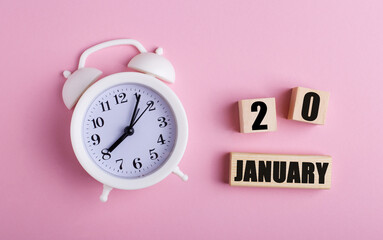 On a pink background, a white alarm clock and wooden cubes with the date of JANUARY 20