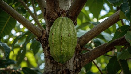 Trinitario cocoa pod maturing early on the branch, ready for harvest at a cacao plantation along a cultural trail.