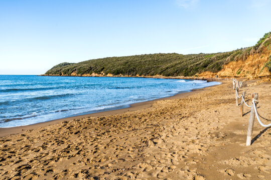 The sandy beach of the Gulf of Baratti, in the municipality of Piombino, along the Etruscan Coast, province of Livorno, Tuscany, Italy
