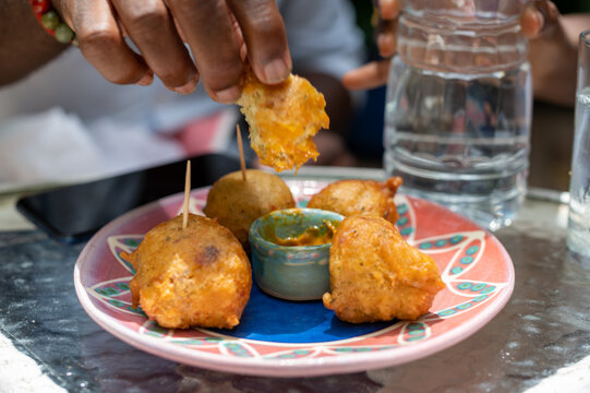 Closeup of a hand dipping delicious Barbadian fishcakes in sauce