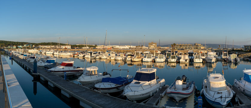Nature park path with Barbate town on the background in sunny Andalusia, South Spain. Popular landmark in Cadiz province