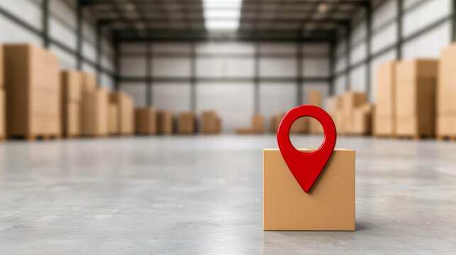A cardboard box with a red location pin stands out in a warehouse filled with stacked boxes, symbolizing delivery and tracking.