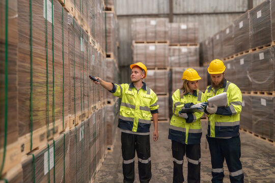 Warehouse team conducting inventory audit with handheld scanner and high-visibility vests