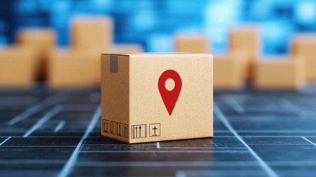 A small cardboard box with a red location marker sits on a grid, representing shipping, delivery, or logistics in a digital setting. Sending, Delivery ,Tracking concept