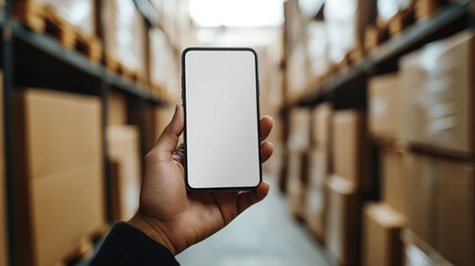 Hand holding smartphone with blank screen in large warehouse with stacked cardboard boxes, concept of inventory management, logistics, supply chain and digital warehouse technology