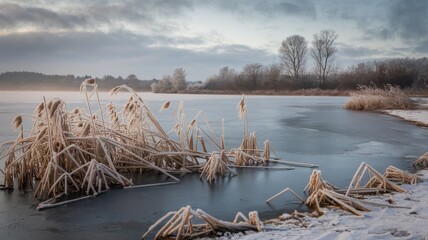 Misty frosted field with bare trees at dawn conveying winter solitude