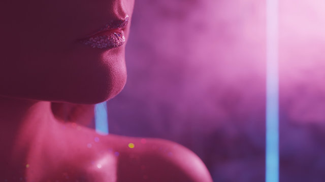 Color smoke face. Night glam. Woman with glitter lips bare shoulder in purple neon light.