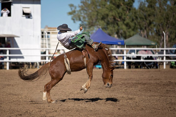 Portrait of happy smiling woman cowgirl, riding a brown horse. Clothed white jeans shorts, brown leather vest. Has slim sport body. Portrait nature. People and animals concept.