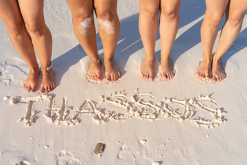 High angle view of four female legs barefoot feet standing on the sand beach by the Thassos written on the sand