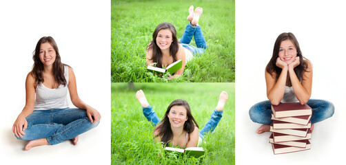 Four studio and outdoor photos of a young female student or elder schoolgirl with and without books, model is eighteen years old, isolated in front of white studio background