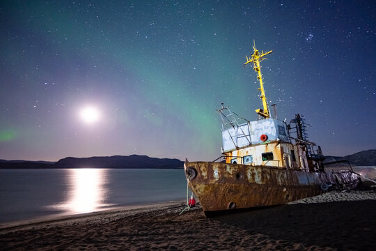 Old abandoned ship with starry sky and northern lights in Teriberka, aurora borelias