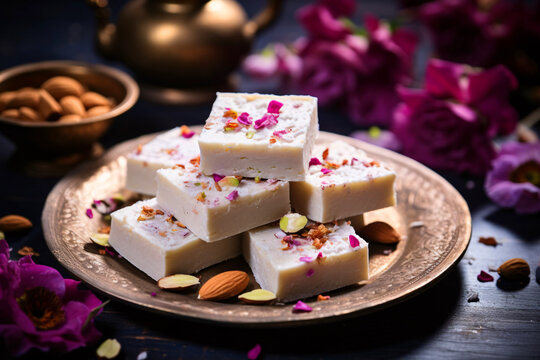 Soft, square Kalakand pieces garnished with almond, pistachio slivers sit on decorative golden plate. Traditional Indian sweet dessert rich, lactic, moist, crumbly, creamy, perfect for festive