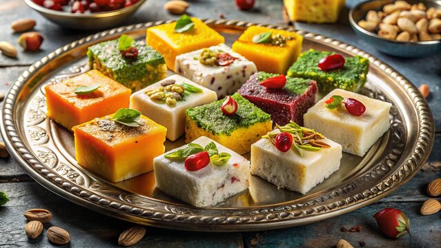 Colorful assortment of traditional Indian sweets, including creamy barfi squares, garnished with chopped nuts and dried fruit, arranged on a decorative silver platter.