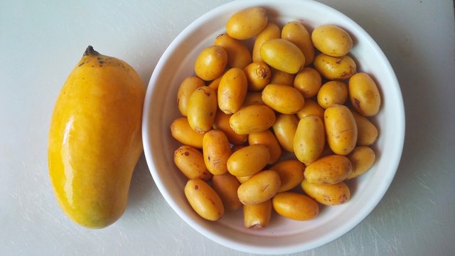 Fresh, sweet yellow Barhi dates and mango on a white background | Yellow, semi-ripe dates and delicious mango presented on a white backdrop.