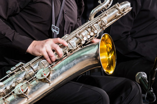 Saxophone player. Saxophonist jazz band playing baritone sax