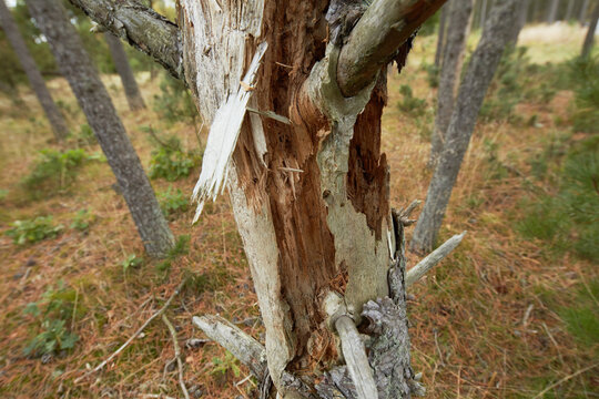 Closeup of damaged beech trees growing in remote forest, meadow, countryside. Tree bark destruction, stripped in illegal activity for firewood. Discovering peace in mother nature and woods in Germany