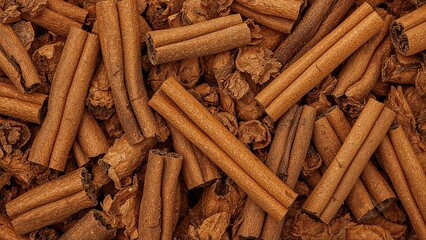 Top view close-up of dried cinnamon bark pieces, a natural brown spice and flavoring agent.