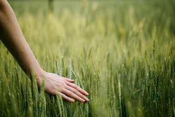 Green ears of barley with water drops after spraying water system close up at agricultural field. Green ear of barley with dew drops.